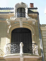 Le hasard de la vie - qui me fait prendre le train tous les jours ! - m’a permis de découvrir une très étonnante maison, située juste devant la voie ferrée, près de la gare de Bécon-les-Bruyères, sur la rue Jean-Moulin, à l’angle de la rue Watteau. Non signée, elle se caractérise par un plan ingénieux, des murs en meulière, des fenêtres d’escalier clairement signalées, une singulière arête de mur en pierre, d’un dessin sobre, mais nerveux. Comme Guimard, l’architecte y souligne toutes les ouvertures par un rang de briques colorées. Néanmoins, à côté de ce pittoresque de banlieue d’inspiration parfaitement rationaliste, un élément autorise une datation plus tardive, presque anachronique : toutes les ferronneries, notamment celles des deux portails, sont manifestement Art Nouveau, ainsi que les poteaux de la grille, aux jolies volutes en coup-de-fouet.