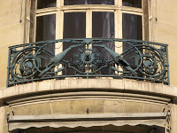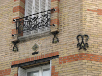 Deux détails permettent tout de même de penser que la maison de la rue Condorcet est légèrement plus tardive que l’autre. Car ses éléments “modernes” sont bien mieux affirmés. La belle ferronnerie de la grande chambre du second étage évoque le style de transition prôné par Benouville, d’inspiration médiévale. Mais, surtout, la façade latérale, à peine visible sur la rue Gallieni - cette même rue où j’ai déjà signalé l’étonnant immeuble aux tournesols de Coulon -, n’est pas avare en surprises. On y trouve d’abord, à l’angle, un immense esselier assez rustique, mais très proche de celui que Guimard employa à la villa Jassedé d’Issy-les-Moulineaux (1893). On remarque surtout une bien étrange fenêtre d’escalier, d’une forme irrégulière, close par des ferronneries très sobres, mais très nerveusement ouvragées à leurs deux extrémités. Ces éléments font immanquablement penser à deux œuvres de Guimard de sa grande période Art Nouveau : le Castel Henriette, à Sèvres, et le Modern Castel, à Garches, tous deux construits en 1899. La même année, Guimard construisit aussi “La Bluette”, à Hermanville-La-Brèche (Calvados), où il s’inspira du colombage normand, tel qu’on le retrouve ici.