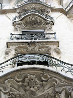 Le vestibule et la cage d’escalier de l’immeuble sont d’une bien plus grande sobriété, même si le travail reste d’une réelle qualité dans le détail. Les plafonds sont ornés de stucs géométriques aux lignes amples, mais très mesurés dans leur développement. On admirera, surtout, un bien joli départ d’escalier. Mais les portes des appartements, où on m’a assuré qu’il existait d’autres jolis plafonds stuqués, n’ont fait l’objet d’aucune attention particulière.