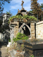 Puisque nous sommes dans le domaine funéraire, et que nous parlons de céramistes, je ne saurais trop recommander d'aller voir, au cimetière du Père-Lachaise à Paris, la très curieuse tombe que l'architecte Georges Guët (1866-1936) construisit pour sa famille, très certainement à l'occasion de la disparition de son père, survenue en 1903. L'édifice, complètement ajouré, paraît malheureusement un peu rachitique, à l'image de ses très effrayants gardiens, et certains de ses détails, en particulier son couronnement et sa jolie croix, auraient pu laisser espérer un peu plus d'excentricité. Mais il faut dire que le monument a été construit dans un espace très étroit, et une végétation envahissante empêche de l'admirer dans les meilleures conditions. Néanmoins, avec l'aide des sculpteurs M. Braemer et T. Prudhomme - celui-ci ayant signé le buste de femme figurant au fond du monument, daté de 1904 -, Guët a réalisé une composition étrange, variée et colorée. Mais l'équipe fut grandement aidée par les céramistes Gentil et Bourdet, qui commençaient alors une carrière qui allait devenir particulièrement brillante. Pour la tombe Guët, ils réalisèrent des éléments en grès à la façon d'Alexandre Bigot, mais en commençant déjà à s'adonner, timidement, à ce qui allait rapidement assurer leur succès : la mosaïque de grès.
