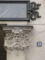L’entrée de service est sur l’une des rues adjacentes. Très simple, elle se compose de quatre solides piliers dont les chapiteaux relèvent complètement de l’Art Nouveau : des têtes barbues y émergent délicatement au milieu de plantes très diverses.