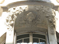 Certes, la façade est assez sagement symétrique, et les ferronneries des balcons appartiennent à un joli modèle industriel, très fréquent à Paris. D’une manière générale, l’immeuble relève d’un style éclectique assez banal. Pourtant, certains détails doivent nous retenir. Evidemment, et principalement, l’étonnante fenêtre ronde du premier étage, décorée d’une très agréable tête féminine, à la chevelure joliment compliquée. Encore une fois, elle sert de base à une travée en saillie. Les vitres elles-mêmes portent des vitraux d’une intéressante composition.