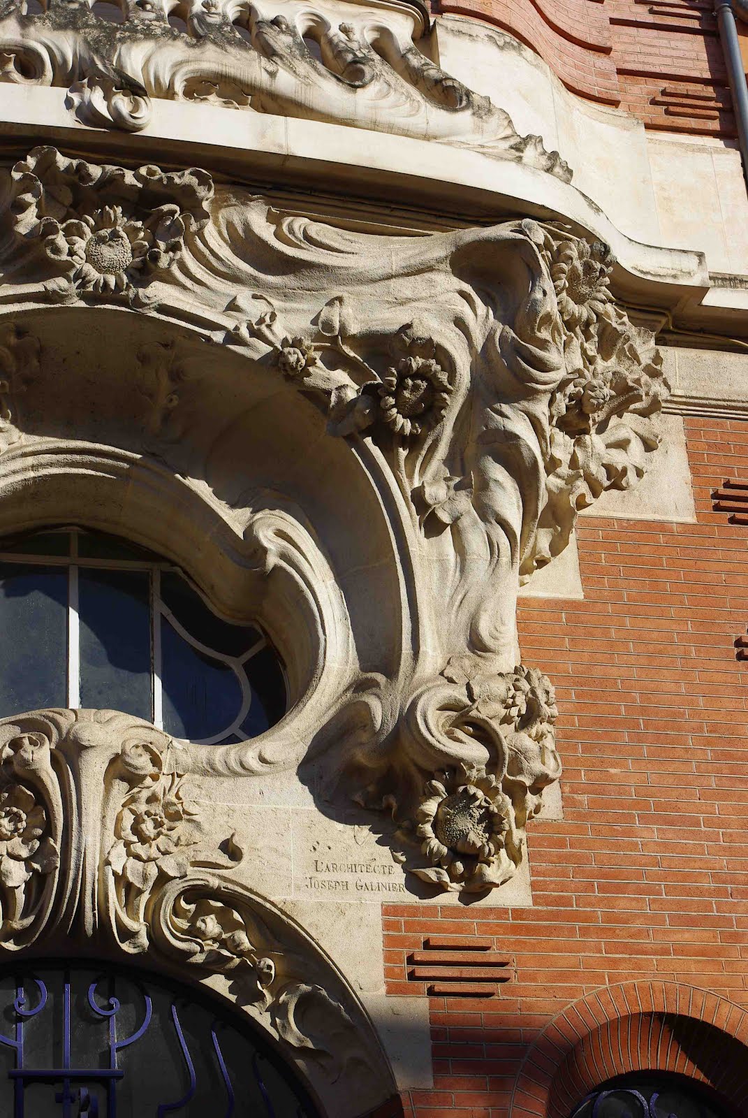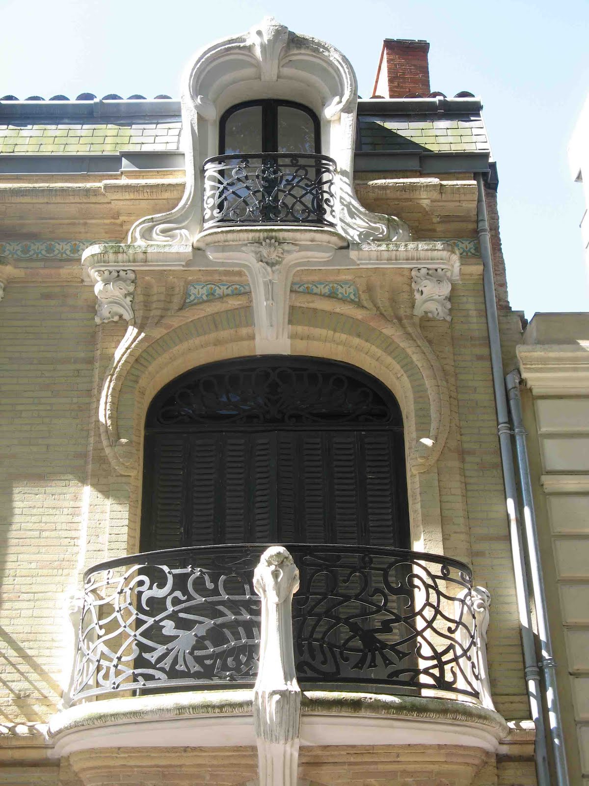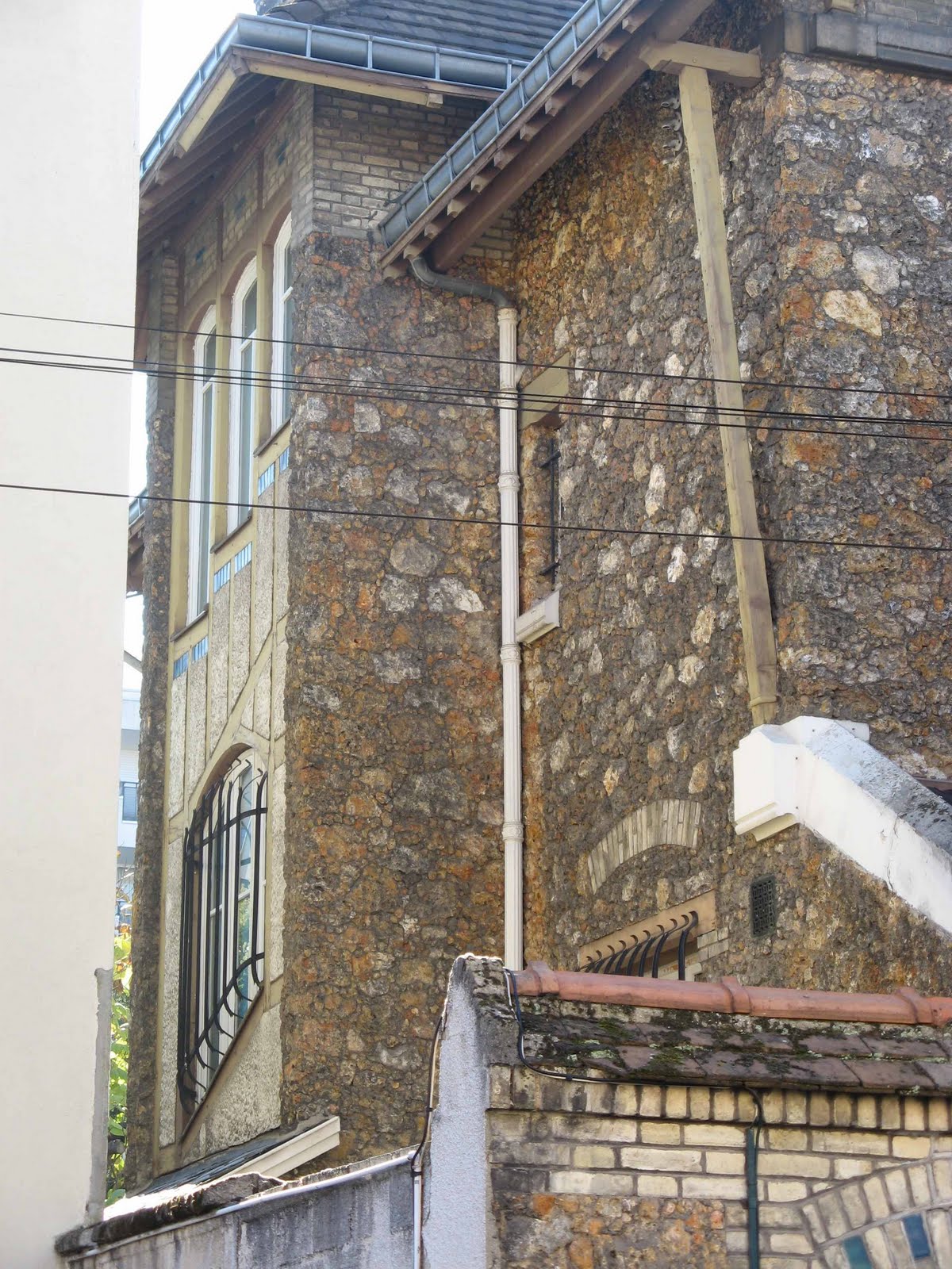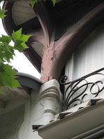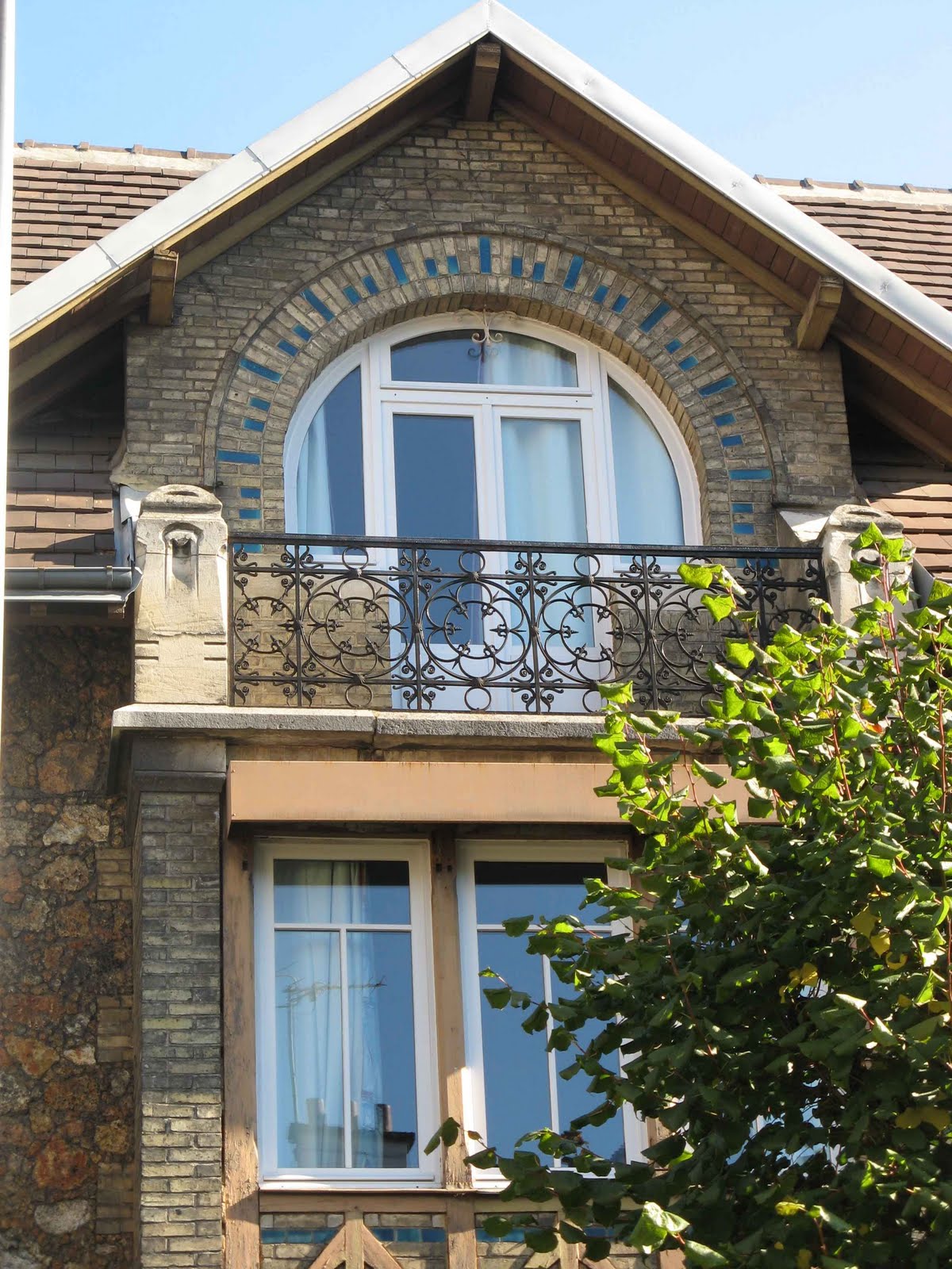 Deux détails permettent tout de même de penser que la maison de la rue Condorcet est légèrement plus tardive que l’autre. Car ses éléments “modernes” sont bien mieux affirmés. La belle ferronnerie de la grande chambre du second étage évoque le style de transition prôné par Benouville, d’inspiration médiévale. Mais, surtout, la façade latérale, à peine visible sur la rue Gallieni - cette même rue où j’ai déjà signalé l’étonnant immeuble aux tournesols de Coulon -, n’est pas avare en surprises. On y trouve d’abord, à l’angle, un immense esselier assez rustique, mais très proche de celui que Guimard employa à la villa Jassedé d’Issy-les-Moulineaux (1893). On remarque surtout une bien étrange fenêtre d’escalier, d’une forme irrégulière, close par des ferronneries très sobres, mais très nerveusement ouvragées à leurs deux extrémités. Ces éléments font immanquablement penser à deux œuvres de Guimard de sa grande période Art Nouveau : le Castel Henriette, à Sèvres, et le Modern Castel, à Garches, tous deux construits en 1899. La même année, Guimard construisit aussi “La Bluette”, à Hermanville-La-Brèche (Calvados), où il s’inspira du colombage normand, tel qu’on le retrouve ici.