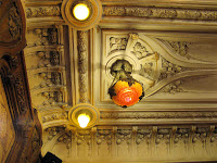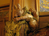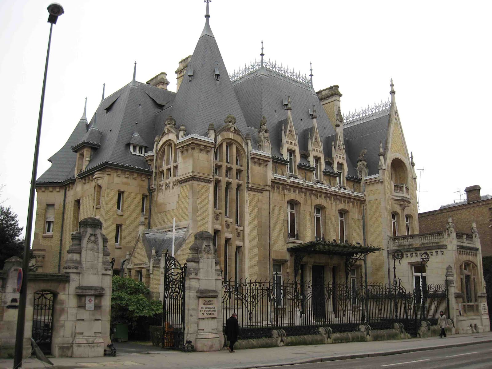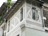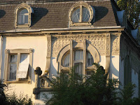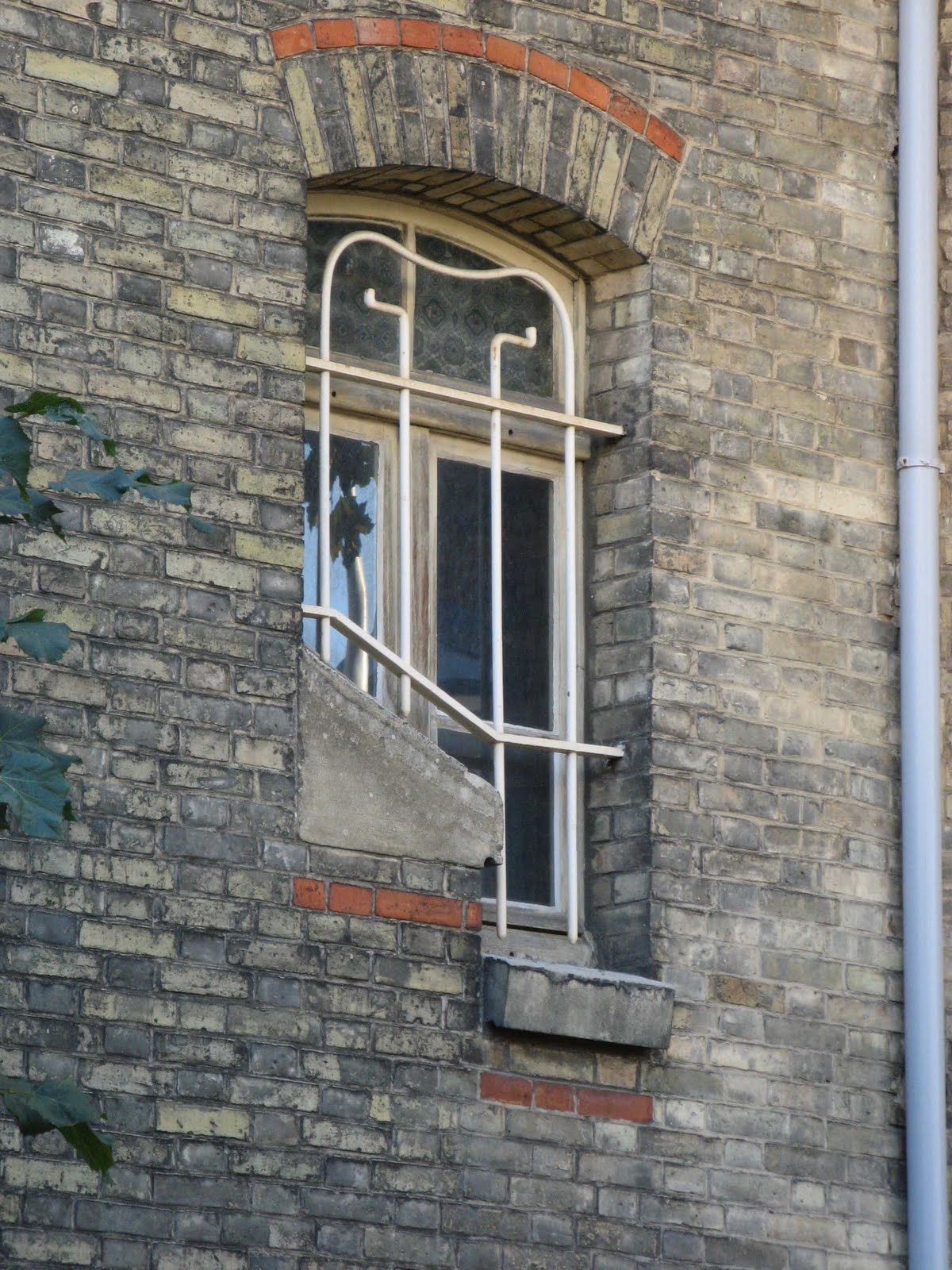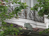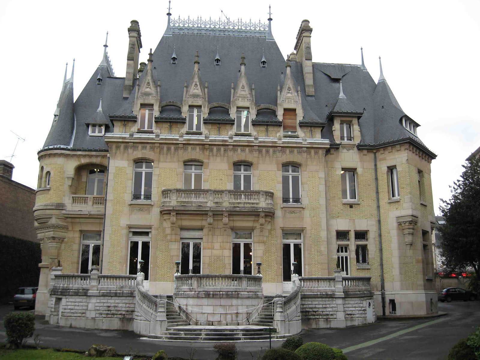 Deux détails permettent tout de même de penser que la maison de la rue Condorcet est légèrement plus tardive que l’autre. Car ses éléments “modernes” sont bien mieux affirmés. La belle ferronnerie de la grande chambre du second étage évoque le style de transition prôné par Benouville, d’inspiration médiévale. Mais, surtout, la façade latérale, à peine visible sur la rue Gallieni - cette même rue où j’ai déjà signalé l’étonnant immeuble aux tournesols de Coulon -, n’est pas avare en surprises. On y trouve d’abord, à l’angle, un immense esselier assez rustique, mais très proche de celui que Guimard employa à la villa Jassedé d’Issy-les-Moulineaux (1893). On remarque surtout une bien étrange fenêtre d’escalier, d’une forme irrégulière, close par des ferronneries très sobres, mais très nerveusement ouvragées à leurs deux extrémités. Ces éléments font immanquablement penser à deux œuvres de Guimard de sa grande période Art Nouveau : le Castel Henriette, à Sèvres, et le Modern Castel, à Garches, tous deux construits en 1899. La même année, Guimard construisit aussi “La Bluette”, à Hermanville-La-Brèche (Calvados), où il s’inspira du colombage normand, tel qu’on le retrouve ici.
