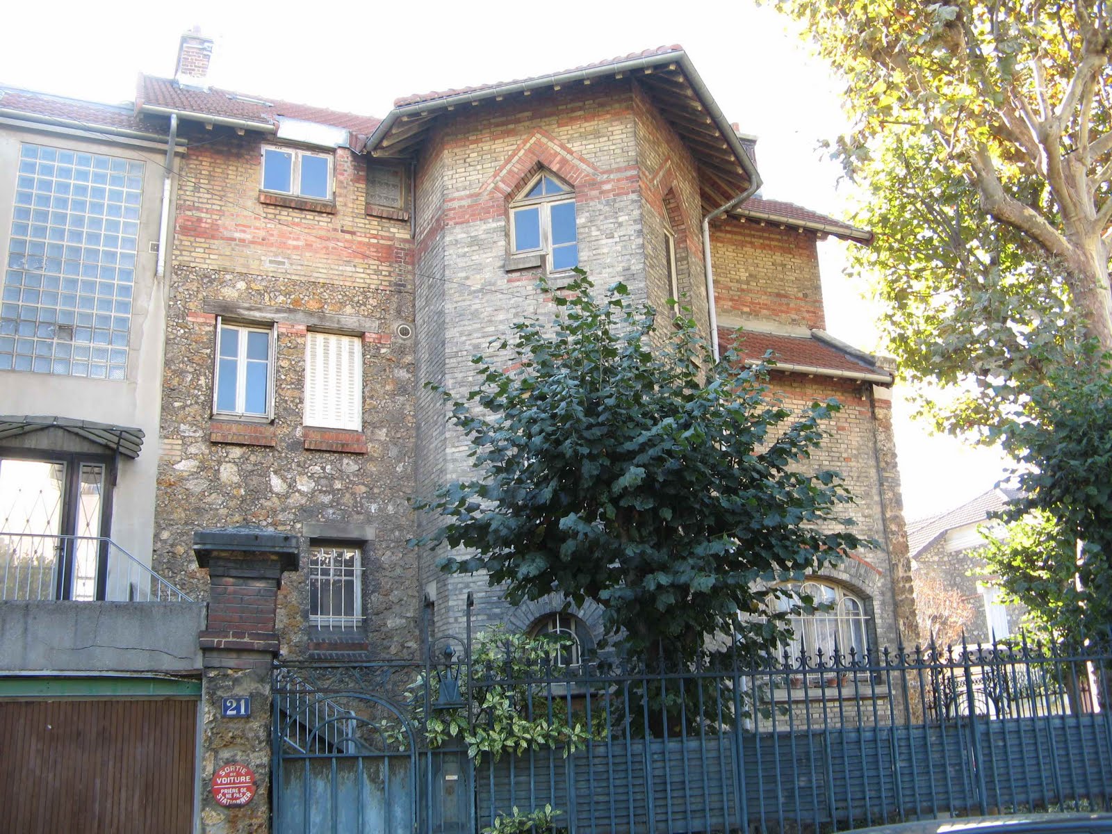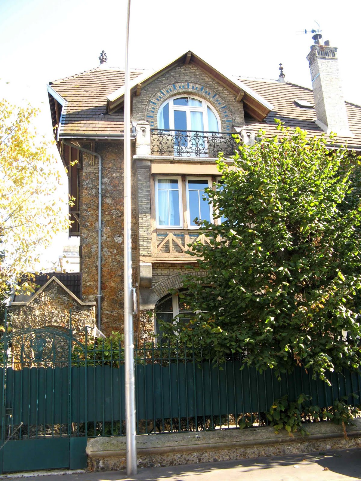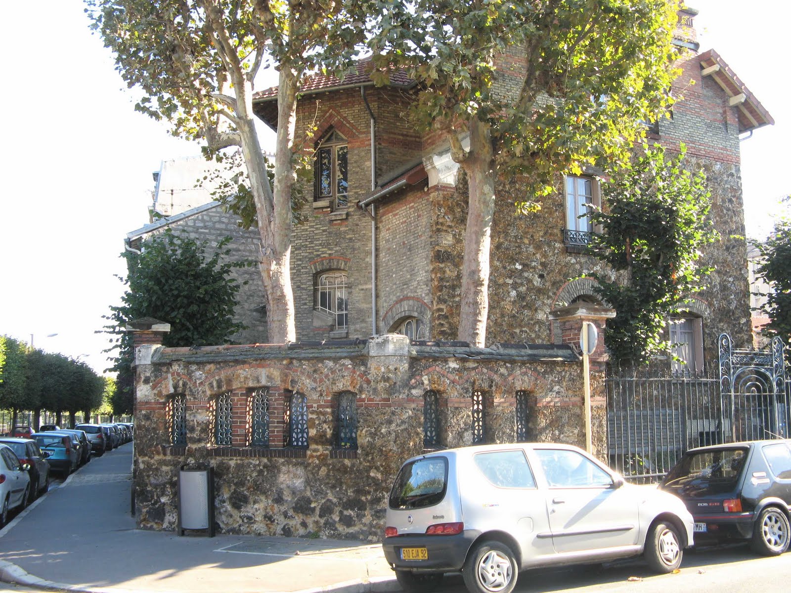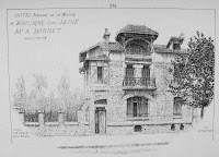 Le hasard de la vie - qui me fait prendre le train tous les jours ! - m’a permis de découvrir une très étonnante maison, située juste devant la voie ferrée, près de la gare de Bécon-les-Bruyères, sur la rue Jean-Moulin, à l’angle de la rue Watteau. Non signée, elle se caractérise par un plan ingénieux, des murs en meulière, des fenêtres d’escalier clairement signalées, une singulière arête de mur en pierre, d’un dessin sobre, mais nerveux. Comme Guimard, l’architecte y souligne toutes les ouvertures par un rang de briques colorées. Néanmoins, à côté de ce pittoresque de banlieue d’inspiration parfaitement rationaliste, un élément autorise une datation plus tardive, presque anachronique : toutes les ferronneries, notamment celles des deux portails, sont manifestement Art Nouveau, ainsi que les poteaux de la grille, aux jolies volutes en coup-de-fouet.