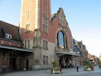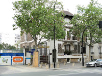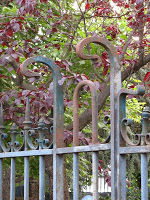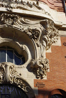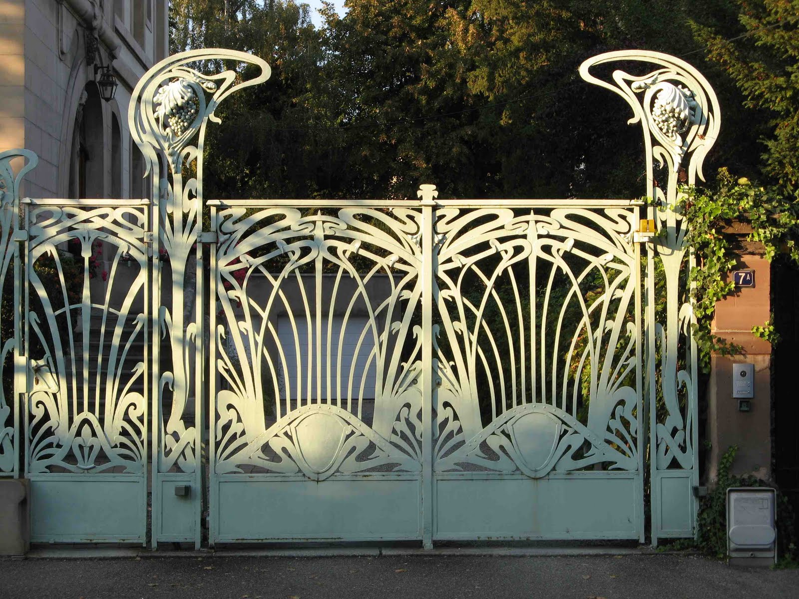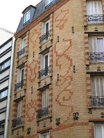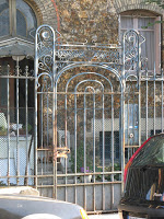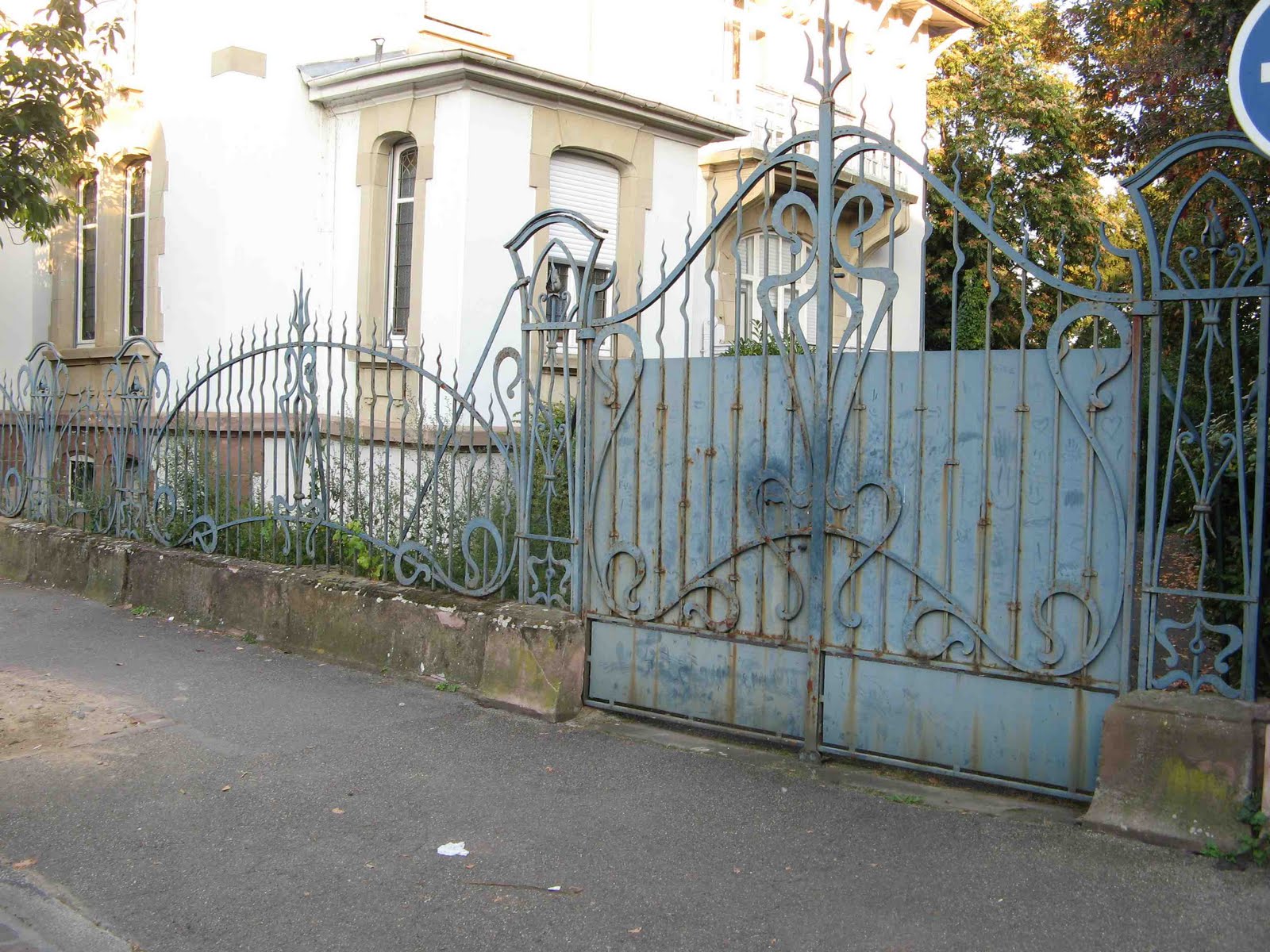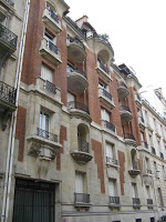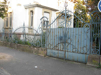 Le hasard de la vie - qui me fait prendre le train tous les jours ! - m’a permis de découvrir une très étonnante maison, située juste devant la voie ferrée, près de la gare de Bécon-les-Bruyères, sur la rue Jean-Moulin, à l’angle de la rue Watteau. Non signée, elle se caractérise par un plan ingénieux, des murs en meulière, des fenêtres d’escalier clairement signalées, une singulière arête de mur en pierre, d’un dessin sobre, mais nerveux. Comme Guimard, l’architecte y souligne toutes les ouvertures par un rang de briques colorées. Néanmoins, à côté de ce pittoresque de banlieue d’inspiration parfaitement rationaliste, un élément autorise une datation plus tardive, presque anachronique : toutes les ferronneries, notamment celles des deux portails, sont manifestement Art Nouveau, ainsi que les poteaux de la grille, aux jolies volutes en coup-de-fouet.