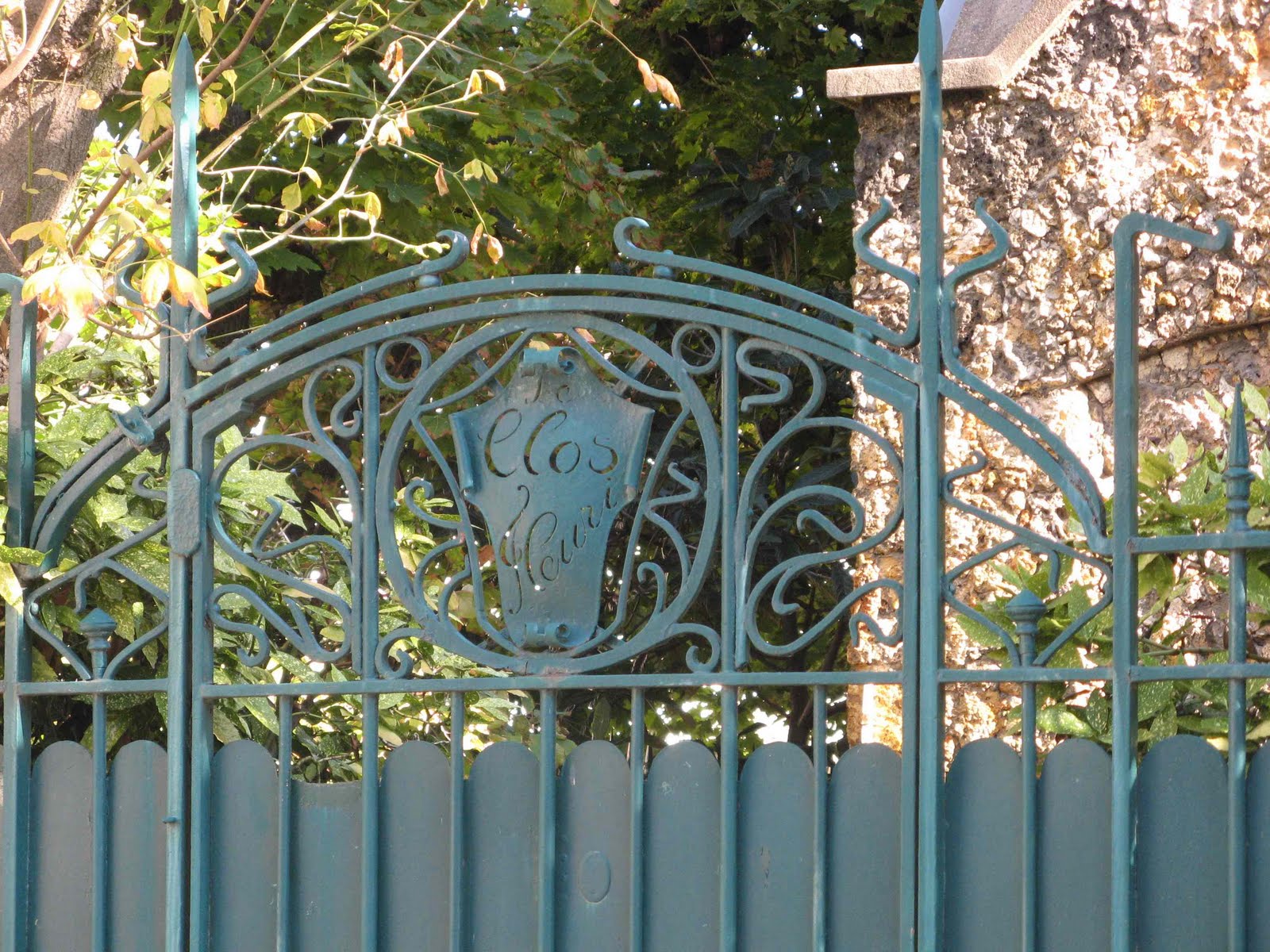 Pareillement située à l’angle de deux voies - l’entrée de service est située au 40 rue Gallieni -, on y retrouve un comparable édicule en meulière, très massif (sur la rue du 22-Septembre, au bout d’un grand jardin), des ponctuations de céramique, au-dessous ou au-dessus des ouvertures, une étonnante arête de mur en pierre, mais aussi un portail Art Nouveau, dont les sinuosités un peu faciles et déjà “nouilles” entourent un écusson portant le nom de la propriété : “Le clos fleuri”. Pour toutes ces raisons, il semble fort probable que les deux maisons ont été dessinées par le même architecte. Et sans doute à la même époque.