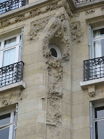 L’architecte s’est magnifiquement tiré de ce chausse-trappe en créant de puissantes scansions, sur ses larges façades, grâce à plusieurs travées en encorbellements, décorées de beaux occuli superbement fleuris, aussi abondamment que les larges gaines de ces saillies. Le sculpteur du décor floral, composé d’une infinité de variations autour de la fleur et de la tige de volubilis, est clairement nommé sur les murs : Seguin, qui signa aussi quelques-unes des plus belles façades du même arrondissement.