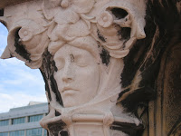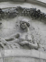 Comme il n’y a pas de saison idéale pour visiter les cimetières, qui sont souvent de véritables petits musées, voici aussi une tombe absolument merveilleuse, dans le cimetière municipal. Là aussi, le monument, dessiné pour la famille Thornklen [nota : voir le P. S.], n’est signé que par un sculpteur : Paul-François Berthoud (1870-1939). Mais celui-ci a peut-être cru inutile de faire appel à un architecte, tant les différents motifs, très abondants, suffisent à donner forme et équilibre à son travail. On notera particulièrement la beauté des deux masques aux yeux fermés - qui ne sont pas sans évoquer les visages fumants de la cheminée de “La Belle et la Bête”, dans le célèbre film de Jean Cocteau -, les petits lézards pourvus d'étranges mains humaines, le dragon de la porte... L'ange assez imposant qui surmonte la chapelle est évidemment plus attendu, mais il donne une jolie silhouette à ce très gracieux monument funéraire. L’ensemble évite tout ridicule, pourtant facile dans ce domaine, grâce à un symbolisme assez complexe et une réalisation d’une superbe délicatesse. Cet art très gracieux pourrait presque faire prendre Berthoud pour le Gilbert français, ce merveilleux sculpteur Art Nouveau anglais, auteur de la fontaine de Piccadilly Circus à Londres et surtout du tombeau du duc de Clarence, dans la chapelle royale de Windsor. On ne s'étonnera donc pas que cet artiste encore très confidentiel soit bien représenté dans les collections du musée d'Orsay avec quatre pièces, malheureusement non exposées actuellement.