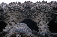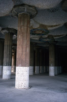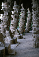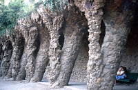 Mais qu’on n’en reste pas là. Le Park Güell est un jardin anglais où la flore est luxuriante. Il faut prendre le temps d’y vagabonder. Et d’autant plus que Gaudi y a conçu tout un réseau de promenades, simples, couvertes, ou même à plusieurs étages, qui constitue certainement la partie la plus inattendue du lieu. D’abord parce que ces promenades, ponctuées par des piliers qui pourraient être aussi bien des colonnes que des troncs d’arbre, ont été faites en béton. Ensuite parce que l’imagination de l’architecte s’y est donné libre cours : ses colonnes sont courbes, inclinées, ou se terminent en paniers. Leur découverte est une surprise de chaque instant, d’autant que leur style rustique - qui n’est pas sans rapport avec les étrangetés du célèbre facteur Cheval - donne lieu à des solutions plastiques totalement neuves pour l’époque, et qui n’ont jamais été égalées depuis.