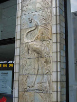 L’immeuble du 92, rue Anatole-France (dont l'adresse était initialement le n°82), n’est malheureusement pas non plus signé. Du moins, par son architecte, car les panneaux de grès portent au moins le nom de leur sculpteur, Charles Virion, qui s’était en partie spécialisé dans la représentation d’animaux. Pour la devanture de l’entreprise de pianos Lary, il eut l’idée assez saugrenue - mais le résultat est absolument superbe - de composer deux grands panneaux aux sujets insolites : des marabouts se reposant dans un marais, à gauche ; des hérons mangeant des grenouilles, à droite. Et, pour décorer le linteau d’une porte, il fit jouer de petits mammifères au milieu des branches de pin. Ceci lui évita sans doute de représenter des jeunes filles sagement installées devant des pianos, genre dans lequel il excellait sans doute bien moins ! Alexandre Bigot traduisit très probablement ces belles scènes de genre animalières en céramique ; on reconnaît les couleurs habituelles de ses grès, souvent bleus ou beiges, et sa façon de réaliser des remplissages avec de simples carreaux, des frises étroites ou avec de minuscules ponctuations presque abstraites, qui firent une grande partie du succès de ses créations.