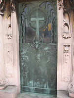 P. S. (du vendredi 13... mars 2009) : J'ai profité d'une jolie fin d'après-midi de tranquilité pour aller voir moi-même cette tombe, projet maintes fois reporté. Cette observation directe m'a fait constater deux choses. D'abord que les concessions ont été délivrées en 1900, ce qui donne la date assez probable de 1901 pour l'édification du monument, une de ses bénéficiaires étant morte le 25 décembre 1900. Par ailleurs, une lecture plus fine des noms inscrits sur le petit autel, à l'intérieur, permet de mieux décrypter l'inscription gravée au-dessus de la porte d'entrée (en partie peu lisible) : il s'agit donc de la sépulture Brault-Jean Thorn-Klein, tous ces noms correspondant à ceux de plusieurs membres de la même famille, dont l'inhumation en ce lieu fut donc prévue dès le début du XXe siècle.