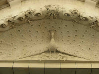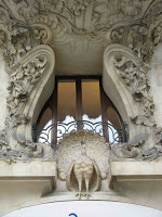 A première vue, l’édifice ressemble énormément à l’immeuble de Wagon de la place Etienne-Pernet, dans le XVe arrondissement de Paris, sauf qu’un soupçon de retenue montre que nous sommes bien en Suisse. En effet, le décor sculpté n’est véritablement luxuriant, voire même envahissant, qu’autour des pans coupés qui ornent les deux angles de la façade. Là, enroulements végétaux, excroissances de pierre et fenêtres arrondies signalent de très loin cette construction singulière, autant que les pittoresques clochetons, en tuiles vernissées, qui émergent des toitures, pittoresque concession au style national suisse. C’est aussi là qu’on peut admirer les fameux paons qui ont donné son nom à la maison, enfoncés dans une interruption de la corniche, faisant la roue et prêts à brailler (hélas, c’est ainsi qu’on nomme très prosaïquement le cri du paon). Sont-ils un jeu de mots sur “paon” et “pan coupé” ? Nous verrons plus loin que les architectes se sont, effectivement, un peu amusés avec le vocabulaire. Ailleurs, la porte, à décor de roseaux, et les autres fenêtres, font l’objet d’une décoration tout aussi soignée, mais beaucoup plus raisonnable.