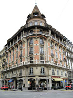 L’architecte Edouard Chevallaz fut sans doute un peu plus audacieux, en 1906, lorsqu’il construisit un immeuble tout aussi imposant, au 2, rue Pictet-de-Rochemont, à l’angle de la place des Eaux-Vives. Grâce à un décor sculpté à motif de fleurs de tournesols, et à quelques panneaux discrètement colorés, derrière les arcs en brique chargés de soutenir la belle galerie ouverte du dernier étage, il sut bâtir un édifice discrètement Art Nouveau, superbement dessiné autour d’un angle majestueux, couronné avec une toiture en forme de poivrière. Son œuvre eut d’ailleurs le singulier honneur d’être publiée dans “Die Architektur des XX. Jahrhunderts - Zeitschrift für moderne Baukunst”, une revue trimestrielle berlinoise, en 1911.