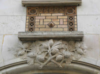 Payret-Dortail est un bon architecte, dont je présenterai certainement un jour une œuvre plus importante. Ses édifices de la rue Claude-Lorrain, non loin du cimetière d’Auteuil, sont des immeubles assez simples, joliment construits, mais qui ne peuvent prétendre au statut de “chefs-d’œuvre”. Entre septembre et la fin du mois de décembre 1911, le n°11 fut commandé par une Société civile de construction, le n°13 par Mme Léméry et le n°15 par la veuve Dufresne. On retiendra surtout, du premier, les jolies pommes de pin qui surmontent la porte, et les jolies terres cuites qui les dominent (j’ai placé l’image en tête de cet article), et, sur le troisième, une amusante rangée de tournesols. On n’oubliera pas d’y remarquer aussi le très poétique détail d’épis de maïs à peine formés, qui ornent le sommet du chambranle de la porte.