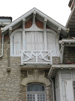La façade latérale - et d’une certaine façon aussi, la façade arrière - a été traitée d’une façon très différente, même si on y retrouve ces chardons qui donnent leur unité décorative à l’édifice tout entier. Là, Tétard a opté pour des éléments plus massifs et presque rectilignes, soulignant d’une façon plus nerveuse les lignes de la construction. Ainsi, un imposant balcon en bois, soutenu par un pilier puissant, s’allie aux conduits de cheminée pour donner à cette partie un caractère faussement défensif.