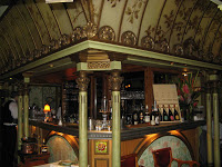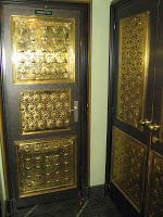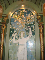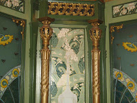 (2) De comparables abeilles décorent les panneaux de cuivre repoussé des portes de service - notamment des toilettes. Les propriétaires actuels de l’établissement m’ont assuré qu’elles dataient aussi de 1896. La présence du même insecte, un peu partout dans l'établissement, et notamment sur le panneau de la "femme aux abeilles", permet, en effet, d'en avoir la certitude.