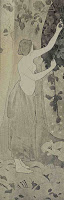 La signature “J. C. Wielhorski” figure en haut du principal panneau de céramique : une charmante jeune femme, au milieu d’un paysage fleuri, lève les bras. D’une main, elle se tient à une branche d’arbre ; de l’autre, elle laisse s’échapper des dizaines de petites abeilles (2). L’ensemble ressemble fort à une allégorie du Printemps. Dans l’article déjà cité de Rivoalen, une autre image représente une seconde femme à demi-nue, paraissant cueillir un fruit sur un arbre, sans doute pour figurer la saison de l’Automne. A première vue, l’œuvre photographiée n’était pas un panneau en céramique, dont on pourrait voir les joints, mais son carton préparatoire. S’il fut joint à l’article, c’est qu’on pouvait certainement alors le voir dans le restaurant ; mais peut-être se trouvait-il alors dans la partie aujourd’hui disparue.