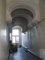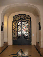 On n’abandonnera pas ce délicieux divertissement visuel sans jeter un coup d’œil dans le couloir intérieur, visible au travers de la porte aux belles ferronneries, dont certaines sont d’ailleurs en accord parfait avec le décor sculpté. L’architecte s’y est à nouveau distingué avec des arcs outrepassés, très sinueux et exagérément développés. L’effet est saisissant et ne manque vraiment pas de charme. Malheureusement, j’ignore si l’imagination débordante de Chauron s’est manifestée plus avant à l’intérieur de son immeuble, n’ayant pu y pénétrer. Mais le peu que j’ai pu apercevoir de l’escalier intérieur ne laisse espérer qu’un retour à la stricte banalité d’un immeuble ordinaire, genre dans lequel cet étonnant créateur s’est sans doute plus couramment illustré.