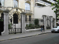 Une descente dans la rue Fresnel permettra, au moins, de se faire une idée des écuries monumentales que le jeune architecte y construisit. De façon assez pratique, ce bâtiment permet aujourd’hui d’accueillir le public sans déranger l’activité propre de l’ambassade. Il est évident qu’il ne servait déjà plus à loger des chevaux depuis longtemps ! Mais le garage qu’on y devinait, il y a encore une vingtaine d’années, conservait encore une grande partie de son agencement d’origine, avec ses belles fermes métalliques. On ne peut malheureusement plus juger de l’éventuelle conservation de ces dernières, au travers de l’immense mur de verre impersonnel qui le clôt désormais. Mais il s’agit peut-être d’un moindre mal, qui a permis de sauver, malgré tout, cet étonnant édifice utilitaire, ingénieux, monumental, orné d’ornements sculptés assez rustiques. Il a au moins conservé sa grande poutre métallique aux simples et délicats enroulements latéraux.