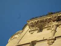 Sous le grand balcon courant du dernier étage, de grands bouquets de pavots ornent les espaces séparant les fenêtres, avec cette singularité que les capsules de chaque fleur semblent légèrement colorées.