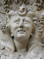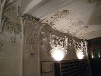 L’entrée de service est sur l’une des rues adjacentes. Très simple, elle se compose de quatre solides piliers dont les chapiteaux relèvent complètement de l’Art Nouveau : des têtes barbues y émergent délicatement au milieu de plantes très diverses.
