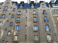 On ne saurait vraiment apprécier ces immeubles en regardant leurs seules façades principales, sur le boulevard Lannes. Malgré la qualité du travail, toujours parfait chez Plumet, elles n’offrent pas la même originalité que leurs “versos”, parfaitement visibles sur le boulevard Flandrin. Là, les murs sont en briques, la pierre étant réservée à quelques entourages de fenêtres et à des garde-corps. L’architecte s’y adonne à un effet très original de composition, qui n’est pas sans évoquer certains immeubles un peu austères des Pays-Bas, à la ligne néanmoins toujours délicate. Ici, point de décor, en dehors des fantaisies d’agencement de frontons très chantournés ou des amusantes toitures à double pente des fenêtres du premier étage de combles. Entre les deux immeubles, dont l’un est légèrement plus large que l’autre, il y a d’assez visibles différences, le n°13-15 étant traité avec un peu plus de richesse que son (presque) voisin.