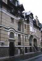 L’activité de Louis Sorel (1867-1933) est loin de s’être limitée à Paris et à la région parisienne. On retrouve sa trace à Reims, dans le Beauvaisis et jusqu’à la côte normande. A Trouville même, il est aussi l’auteur d’une villa bourgeoise, au 119, avenue du Général-Leclerc, où se trouve parfaitement illustré son goût pour les toitures élancées et pour les balcons suspendus, aux consoles en forme de marches d’escalier renversées. Mais je voudrais surtout évoquer ici un bien joli de complexe immobilier, composé de deux grosses bâtisses, aux n°5 et 7 de la rue Pasteur, la première étant prolongée, sur la rue Denain, par une plus petite maison, enfoncée dans son terrain et close par un beau portail en bois vert.