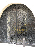 Car la porte existe, en effet, et elle est bien circulaire. Sauf qu’elle ne s’ouvre pas entièrement : le passage se fait par deux battants rectangulaires, qui ne constituent qu’une partie du cercle. Le mystère, finalement, était assez simple et la réalité apparaît presque trop banale. Si le travail de fer forgé reste assez remarquable, et assez proche du dessin original, la partie sculptée qui est chargée de l’encadrer apparaît beaucoup plus simple et décevante, réduite à des enroulements et à une sobre simulation d’écailles de poissons. Mais l’illusion demeure, malgré tout, et reste originale.