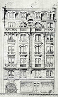 C’est grâce à la publication de plans dans "La Construction Moderne", peu de temps avant la déclaration de guerre, que cet édifice attira mon attention, tant à cause de la structure générale de l’immeuble, d’un Art Nouveau visiblement débridé et démonstratif, que par la forme très insolite de sa porte d’entrée : en effet, celle-ci se présente, sur le dessin, sous l’apparence... d’un cercle parfait ! Comment cette porte pouvait-elle s’ouvrir aisément et permettre un accès facile au vestibule de l’immeuble ? Voilà qui excita immédiatement mon imagination.