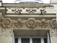 Les bow-windows, fortement ceinturés par de larges balcons, n’apparaissent pas si saillants qu’ils promettaient de l’être, et l’animal, familier ou plus inquiétant, n’occupe pas l’emplacement qui lui était réservé. Mais le travail de sculpture, assez naïf dans ses proportions exagérées, plaît par une sorte de rusticité peu commune : le décor laisse alterner les tournesols et les chardons, plantes assez banales pour l’époque, mais qui apparaissent assez rarement sur une même façade. Par endroits, notamment sous le balcon du deuxième étage, l’ornementation se résume à de curieux motifs, stylisés à l’extrême et réduits à l’état de simples frises incisées, curieux enroulements végétaux où on pourrait reconnaître l’évocation vague de visages humains.