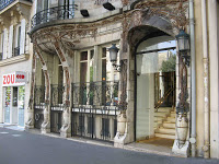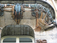 La porte d’entrée propose de jolis motifs de paon à la queue déployée, en fer forgé découpé, ainsi qu’une drôle de salamandre, servant à décorer la clé de voûte de son entourage. Camille Alaphilippe, collaborateur de Bocage dans la rue de Hanovre et dont on connaît le style parfois rugueux, fut-il l’auteur de ce curieux animal, inconfortablement posé sur quelques nouvelles feuilles ? Le sculpteur n’est malheureusement pas crédité sur la façade. Il est donc impossible de déterminer s’il y intervint, et quelle fut l’importance de cette collaboration.