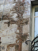 Ailleurs, ces frises de grès prennent des formes de scarabées très stylisés ou deviennent des motifs circulaires moins caractérisés. Quelques carreaux beaucoup plus abstraits complètent cette étonnante décoration, de part et d’autre de chaque fenêtre.