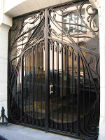 La porte d’entrée propose de jolis motifs de paon à la queue déployée, en fer forgé découpé, ainsi qu’une drôle de salamandre, servant à décorer la clé de voûte de son entourage. Camille Alaphilippe, collaborateur de Bocage dans la rue de Hanovre et dont on connaît le style parfois rugueux, fut-il l’auteur de ce curieux animal, inconfortablement posé sur quelques nouvelles feuilles ? Le sculpteur n’est malheureusement pas crédité sur la façade. Il est donc impossible de déterminer s’il y intervint, et quelle fut l’importance de cette collaboration.