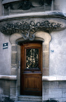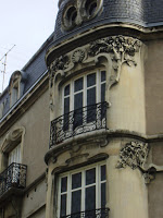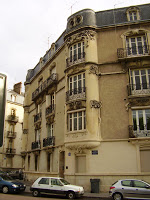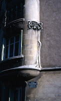 Lorsque j’avais photographié l’édifice, il y a quelques années, il n’avait pas été nettoyé et restait conservé dans une grisaille “pittoresque” qui accentuait la naïveté de son décor floral, notamment autour de son oriel d’angle. J'avoue avoir complété l'envoi, qui ne permettait pas de bien savourer les détails, avec ces images plus anciennes, qu'on identifiera aisément par leur tonalité plus sombre.