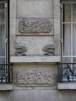 A la même époque, Gauthier construisait encore sur la rue Lamarck, notamment l’immeuble du n°103. Si l’influence du Modern Style s’y fait beaucoup moins sensible, en dehors de la belle ferronnerie des deux portes d’entrée, j’invite malgré tout les amateurs curieux à admirer les amusants carreaux de faïence signalant, au-dessus de l’une d’entre elles, l’entrée d’un bains-douches : des petits amours facétieux s’y arrosent avec un jet d’eau. L’un d’entre eux parvient à éviter la douche... mais un autre... pas !