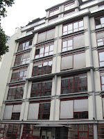 A l’opposé de la période, on peut aussi aller voir un autre très singulier immeuble d’Auscher au 69-71 rue Beaubourg. Il fut élevé en 1910, encore une fois pour la maison Félix Potin, aux employés de laquelle il devait servir de dortoir. La sagesse de la façade signale un bâtiment d’une impeccable efficacité, d’une rigueur presque classique, construit avec des matériaux d’une grande simplicité.