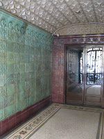 Le vestibule, par contraste, propose aux locataires des panneaux d’un vert beaucoup plus bleuté ou d’un brun rougeâtre, à motifs de rosiers fleuris, sous un étonnant plafond arabisant à décor géométrique à fort relief. Müller y a une seconde fois signé son travail, à la droite de la porte ouvrant sur la cage d’escalier : “Emile Müller / Céramiste / Ivry-Port / Paris”.
