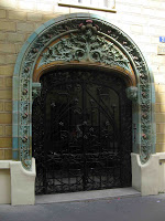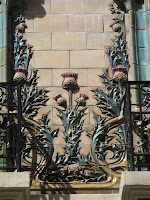 Avec encore plus d’audace - mais avec une imagination beaucoup plus mesurée - que Lavirotte, qui avait conservé quelques assises en pierre de taille sur sa façade de l’avenue Rapp, Klein a opté pour un immeuble intégralement recouvert de grès flammé, une singularité qui lui assura une immédiate renommée, au titre de la performance technique. Pour cela, il fit appel à Emile Müller, dont ce devait être la dernière création importante avant sa mort, en 1903. En dehors de quelques têtes échevelées, le décor est entièrement consacré au chardon, à partir duquel les deux artistes ont créé de multiples variations, en utilisant sa tige, ses feuilles, et ses fleurs épanouies, touches de rose poétiquement distribuées au milieu d’un océan de sombre verdure. La porte elle-même - dont la sublime ferronnerie est l’œuvre de Dondelinger, déjà collaborateur de Lavirotte dès la rue Sédillot - propose un imposant poème de grès en l’honneur de cette plante.