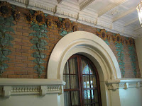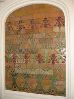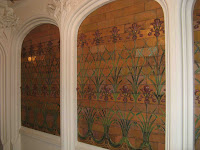 En effet, à partir du vestibule, il n’y a pas de doute : Charles Plumet est devenu un architecte Art Nouveau, et à une époque où le Castel Béranger de Guimard n’avait pas encore été révélé au public. Emile Müller a créé avec lui de vastes panneaux de faïence polychrome, d’où émergent de beaux iris en assez fort relief. Ils s’harmonisent parfaitement avec le reste de la décoration, en stuc ou en mosaïque de sol.