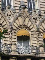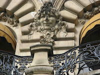 Nous avons déjà dit (voir au 16, rue d’Abbeville) toute l’ambiguïté que Massa pouvait avoir avec le monde de l’Art Nouveau. Encore une fois, il nous propose ici une façade extraordinairement originale, de style très italien - osons même l’appeler “milanais”, tant certaines maisons de Milan savent avoir cette virile robustesse ! -, avec des pierres travaillées en bossage. A première vue, rien de réellement Art Nouveau dans cette architecture massive. Sauf que la maison n’évoque précisément aucun style historique alors en faveur à Paris ; l’exagération même de tous ses détails, la franchise d’un décor pesant et compliqué, semblent se rapprocher de l’Art Nouveau sans y toucher vraiment. Néanmoins, quelques détails de sculpture ne sont pas sans rapport direct avec l’univers qui nous intéresse, en particulier plusieurs têtes de femmes très “fin de siècle”.