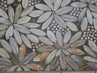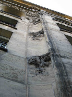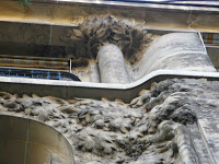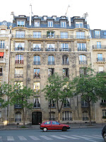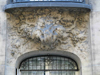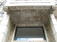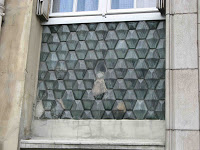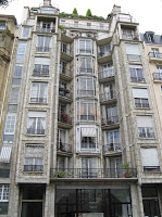 Nous sommes ici très loin de ce que les Perret avaient réalisé avenue de Wagram. Là où la façade ondulait, nous n’avons plus que des angles droits ; là où un décor végétal naturaliste montait à l’assaut des étages supérieurs, nous n’avons plus qu’un revêtement simple, à la limite de l’abstraction, composé de tapis de feuilles peu caractérisées, avec des ronds et des perles pour meubler les interstices. Les portes d’entrée, quoique assez monumentales, sont d’une grande austérité. Seule concession aux grâces de l’époque : de plaisantes grenades éclatées, servant de pendeloques aux deux auvents protégeant les deux accès à l’immeuble. On remarquera au passage, au-dessus de la porte de service, un curieux panneau de briques de verre, fabriqué par le même Falconnier qui avait orné le mur mitoyen des deux escaliers de l’aile principale du Castel Béranger de Guimard.