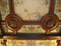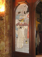 Eugène Martial Simas (1862- ?) est à peine mieux connu. Auteur de la décoration du pavillon LU à l’Exposition universelle de 1900, et collaborateur de la magnifique décoration intérieure du château Laurens à Agde (1898-1901), il travailla quelques années pour la manufacture de Sèvres, mais collabora plus abondamment avec celle de Sarreguemines. Pour Mollard, il y réalisa de charmantes petites scènes de genre contemporaines, destinées à illustrer quelques destinations pittoresques de la gare Saint-Lazare, dont Trouville, Saint-Germain-en-Laye ou Ville-d’Avray. Dans le vestibule, il dessina deux autres compositions, très étonnantes : “Le départ”, montrant des voyageurs de dos, dont une femme avec un paquet orné de quelques lettres permettant de comprendre qu’elle arrive directement des grands magasins, et “L’arrivée”, où des personnages équivalents sont présentés de face. La composition la plus ambitieuse, très amusante, est l’immense panneau qui orne le mur complet d’un salon isolé. Elle représente un souper de fêtards sortant d'un bal costumé : un Pierrot s'y laisse attacher les mains dans le dos avec des serpentins et une jeune femme lui présente une coupe de champagne ! Par la présence d’un “M” sur le fond du décor, il ne fait aucun doute que cette étrange scène a volontairement été située chez Mollard, où l’initiale du propriétaire est omniprésente.