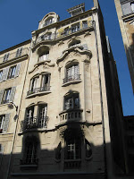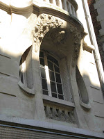 Certes, la façade est assez sagement symétrique, et les ferronneries des balcons appartiennent à un joli modèle industriel, très fréquent à Paris. D’une manière générale, l’immeuble relève d’un style éclectique assez banal. Pourtant, certains détails doivent nous retenir. Evidemment, et principalement, l’étonnante fenêtre ronde du premier étage, décorée d’une très agréable tête féminine, à la chevelure joliment compliquée. Encore une fois, elle sert de base à une travée en saillie. Les vitres elles-mêmes portent des vitraux d’une intéressante composition.
